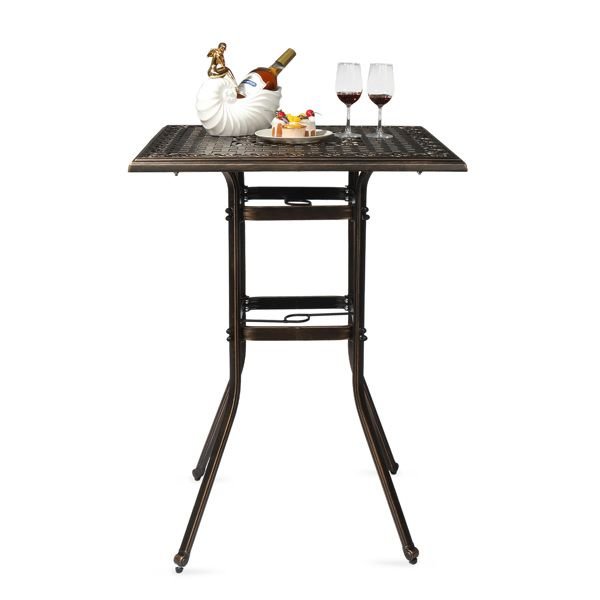 Experience the perfect blend of elegance and functionality as you indulge in outdoor dining and entertainment with this exceptional Patio Bar Height Table. Crafted with meticulous attention to detail, this table boasts a stunning antique bronze finish that adds a touch of sophistication to any setting. Its square tabletop features a smooth surface and an intricate hollowed pattern, creating a visually captivating focal point for your porch, balcony, backyard, or garden. Designed to withstand the elements, this table is made from durable cast aluminum, ensuring long-lasting durability without compromising on style.
