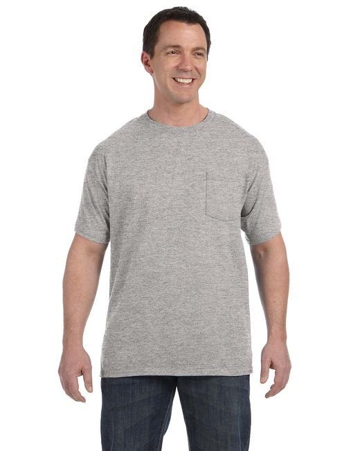 6 oz.; 100% preshrunk cotton; Ash: 99/1 cotton/poly; Light Steel: 90/10 cotton/poly; Charcoal Heather: 60/40 cotton/poly; Made with sustainably sourced USA grown cotton; Tagless 6 oz. styles are transitioning to the Authentic-T Family; Tag-free neck label transitioning to tear away label; INVENTORY MAY BE MIXED; Set-in 1x1 rib crewneck; Five-point left-chest pocket; Self-fabric neck tape for comfort; Quarter-turned body; Double-needle sleeves and bottom hem; 'A' list status from CDP (Carbon Disclosure Project); Energy Star Partner of the Year (12 consecutive years); Every piece of Hanes apparel purchased from our company qualifies for Hanes4Education;