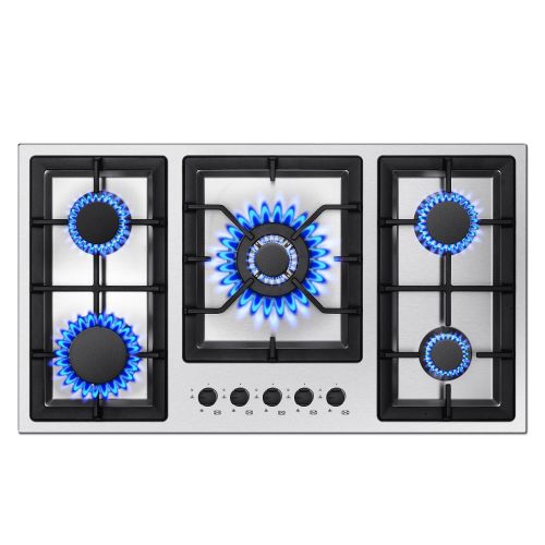 About this item[5 High Efficiency Burners]This 36 inch gas cooktop offers 5 high efficiency sealed burners: 1 x 10,500 BTU + 1 x 8,189 BTU + 2 x 6,414 BTU + 1 x 3,071 BTU. Each burner distribute even heat for simmering, boiling, stir-frying, steaming, melting or even caramelizing! It is very suitable for daily use at home and can meet the needs of different cooking styles.[Safety Protection]The thermocouple flame-out failure device system(FFD) will shutoff the gas automatically after 60 seconds if a flame is not detected to ensure your safety in an emergency. Melt-proof bakelite knob with child lock need to press and rotate at the same time to ignite, preventing children from accidentally touching. Gas stovetop with double protection to keep your family safe.[Easy Maintenance]The gas stove top is made of brushed stainless steel, which is heat-resistant, corrosion-resistant and wear-resistant. 5 sealed burners prevent food from falling into them. You can simply remove the grate and wipe it clean with water or detergent. The heavy cast iron grates support all kinds of heavy pots steadily and can be cleaned in the dishwasher for hassle-free.[NG/LPG Convertible & Electric Ignition]The initial setting of the gas range stove is for natural gas, and there is a conversion kit for LPG, you can choose either gas supply as you like. The automatic electric pulse ignition uses a 110V AC power. Please note that natural gas pressure regulator and gas pipe are NOT included.