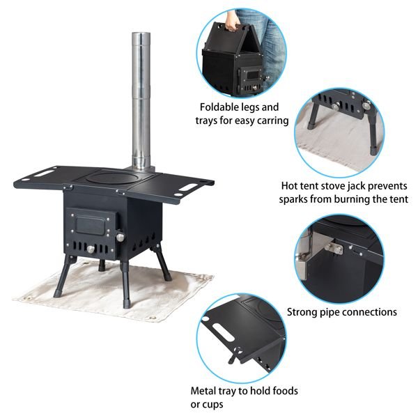 Portable Wood Stove.The folding racks on both sides increase the functionality of easy portability, 17.6lbs. The side frame can be used as a portable. The foldable legs can be folded flat under the stove. The chimney tube can be easily stored in the furnace for easy transportation and storage. The hook that comes with the wood stove makes it easy to clean the ashes at the bottom. Provide more convenience for your camping/hunting trip.